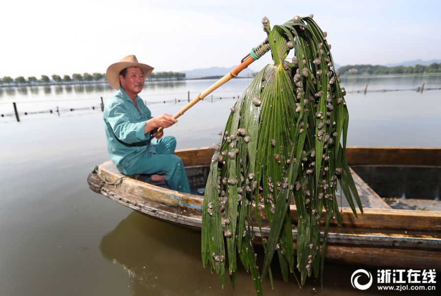 6月26日,杭州西湖水域管理處的工作人員正在北里湖用棕葉打撈水底的螺螄。由于西湖水底螺螄密度過大,對水生植物生長造成影響,西湖水域管理處使用了新武器,把粽葉放入水底,讓螺螄爬到粽葉后再捕撈。據(jù)悉,這是浙江偉大園林公司幾個(gè)研究生想出的新辦法,截至6月26日已經(jīng)試驗(yàn)4天,每天可清理螺螄五六十斤。((浙江在線記者 王堅(jiān)穎 林云龍 汪馳超 攝))