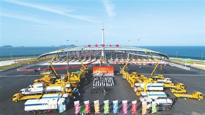 港珠澳大橋主體工程首批45輛拯救及養護設備近期正式交付使用,這批設備包括洗掃車、隨車吊、防撞車等。 新華社記者 梁 旭攝
