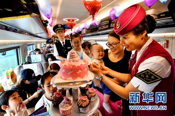 6月26日,在北京南至上海虹橋的G1次“復(fù)興號(hào)”列車上,乘務(wù)員與旅客一起切蛋糕慶祝。當(dāng)日,由北京南至上海虹橋的G1次“復(fù)興號(hào)”列車上舉行“復(fù)興號(hào)”運(yùn)營(yíng)一周年慶祝活動(dòng)。“復(fù)興號(hào)”是由中國(guó)鐵路總公司牽頭組織研制、具有完全自主知識(shí)產(chǎn)權(quán)、達(dá)到世界先進(jìn)水平的中國(guó)標(biāo)準(zhǔn)動(dòng)車組,自2017年6月26日投入運(yùn)營(yíng)以來,以其良好的乘車體驗(yàn)廣受旅客歡迎。新華社發(fā)(楊寶森 攝)