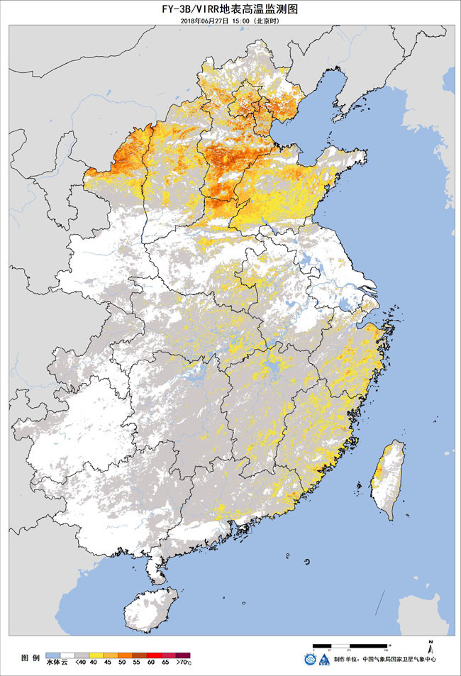 圖1 FY-3B/VIRR氣象衛(wèi)星地表高溫監(jiān)測圖 2018年6月27日