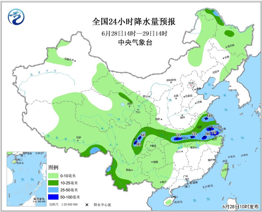 未來,隨著天氣系統(tǒng)的緩慢南壓,主要降水區(qū)還將維持在江淮、江漢、江南北部。6月28日到7月1日,雨帶基本在上述區(qū)域擺動。