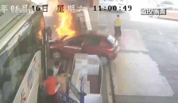 監控畫面顯示,6月16日上午11點左右,中石油長沙市岳麓大道加油站內,一輛紅色轎車突然失控撞倒加油機,隨即引發大火。