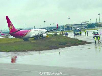 飛機(jī)滑出跑道斜停在草坪上