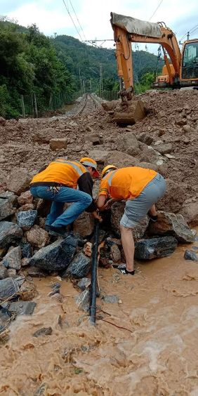 14日凌晨3點,經過將近3小時、8公里的徒步行走,劉金樂終于到達橫現河水害處所。他二話不說,拿起鐵鍬帶領大家清理排水溝,用礦泉水瓶、棉紗清理箱盒內部積水。