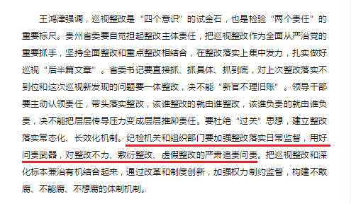 “中央巡視工作領導小組成員楊曉超主持召開向山西省委書記駱惠寧的反饋會議”“中央巡視工作領導小組成員姜信治主持召開向江蘇省委書記婁勤儉的反饋會議” “中央巡視工作領導小組成員王鴻津主持召開向湖南省委書記杜家毫的反饋會議”……中央紀委國家監委網站公布的巡視反饋情況顯示,中央巡視工作領導小組副組長和成員分赴各被巡視地方和單位,主持召開了向其黨組織負責人的反饋會議,出席了向其領導班子反饋常規巡視情況會議,并對他們抓好巡視整改工作提出了要求。首次實現所有巡視反饋會議均有中央巡視工作領導小組副組長或成員出席,這體現了對做好巡視整改的愈加重視。