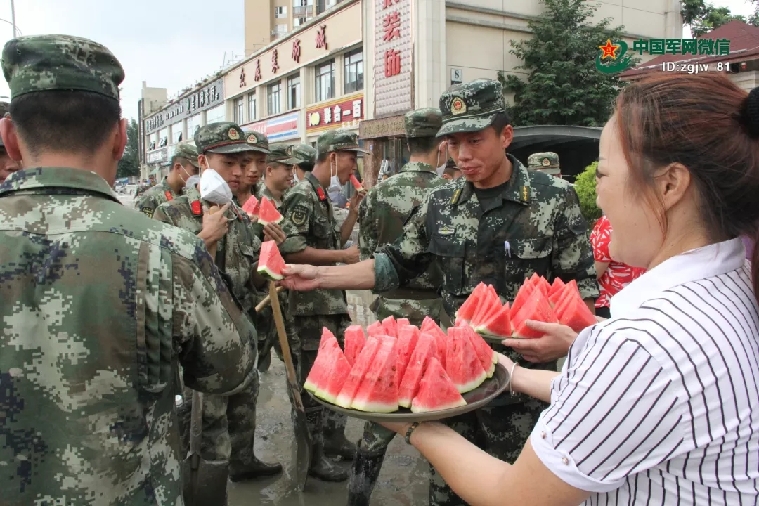 群眾自發(fā)為救災官兵送西瓜。劉學功 攝