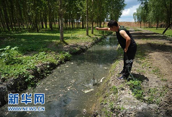 在吉林省長春市,黑臭水體專項督查組工作人員在一處向新凱河排水的水溝采樣(6月28日攝)。 新華社記者 才揚 攝