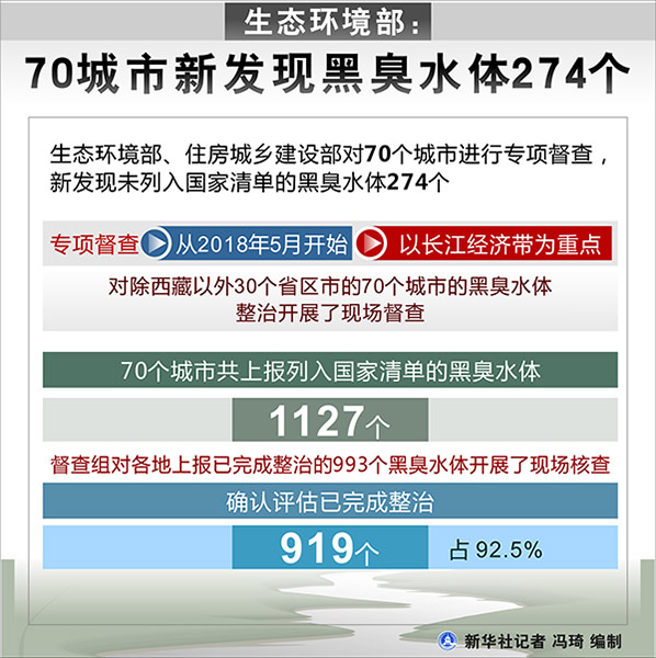 在生態(tài)環(huán)境部當天舉行的新聞發(fā)布會上,張波說,專項督查從今年5月開始,以長江經(jīng)濟帶為重點,對除西藏以外30個省區(qū)市的70個城市的黑臭水體整治開展了現(xiàn)場督查。70個城市共上報列入國家清單的黑臭水體1127個。督查組對各地上報已完成整治的993個黑臭水體開展了現(xiàn)場核查,確認評估已完成整治919個,占92.5%。但與此同時,督查還發(fā)現(xiàn)未列入清單的黑臭水體274個。“被督查城市黑臭水體完成比例統(tǒng)算起來比例就不高了。”