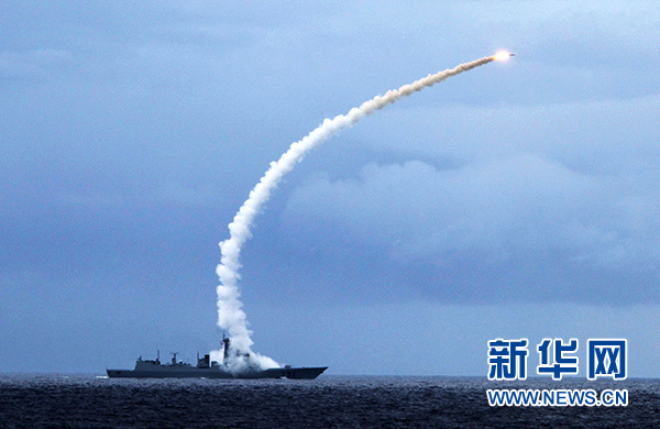 海口艦在實(shí)彈演習(xí)中發(fā)射艦空導(dǎo)彈攔截來(lái)襲目標(biāo)(2010年7月26日攝)。 新華社發(fā)