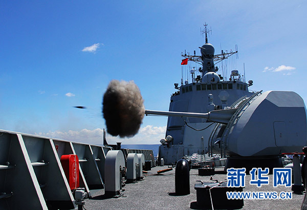 在多國(guó)聯(lián)演任務(wù)中,海口艦進(jìn)行主炮射擊(2014年6月19日攝)。 新華社發(fā)(于林 攝)