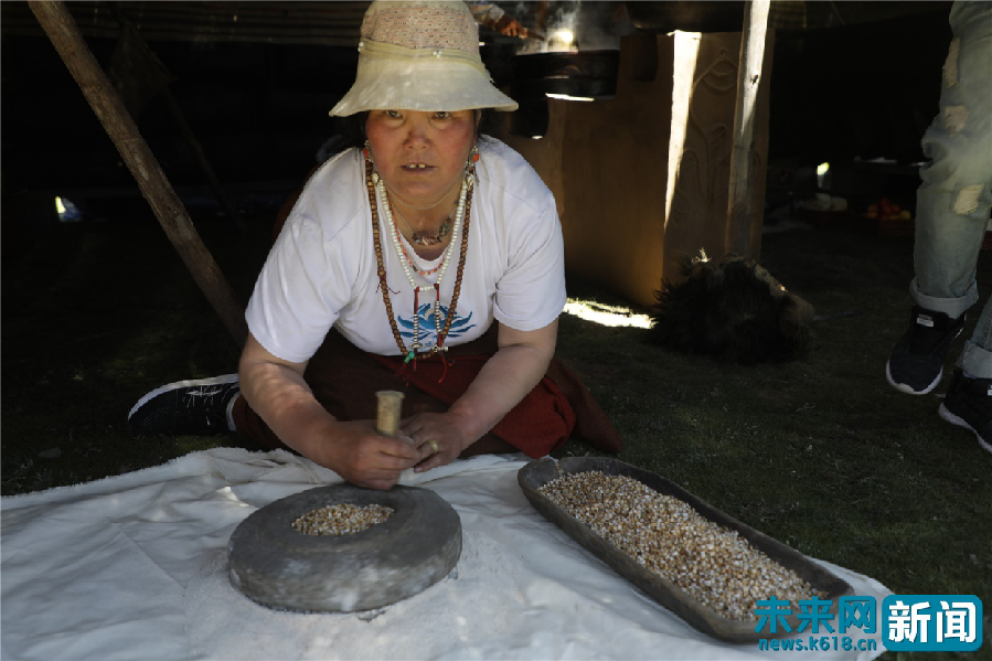 帳篷里,一位藏族阿姨正在手工磨青稞,把一粒粒飽滿的青稞磨成細(xì)細(xì)的粉,后續(xù)這些青稞粉會(huì)被進(jìn)一步加工成青稞餅等藏族特有的食物。