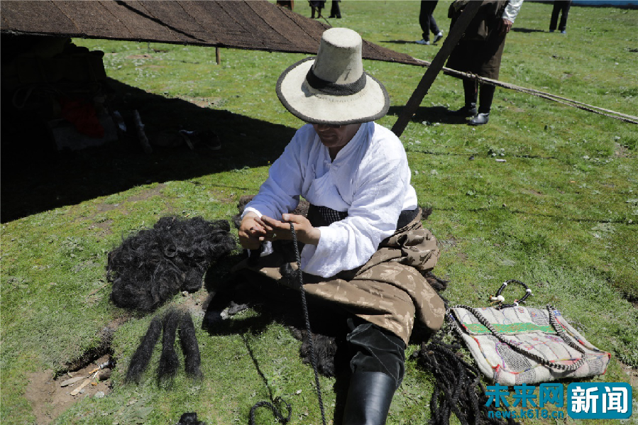 用牦牛毛編織繩子的東科日村村民。未來網(wǎng)記者謝深森 攝