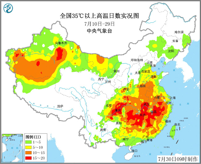 孫軍:7月10日以來,我國中東部地區出現大范圍持續性高溫天氣,四川盆地、江南、華南以及黃淮、江淮、江漢、華北東部和南部、東北南部均有影響。其中重慶、湖北、湖南、江西、安徽、浙江中西部等地35℃以上高溫日數達10~18天。