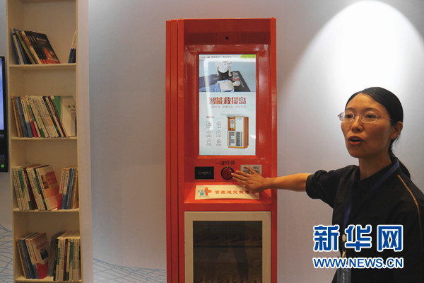 圖為工作人員在講解智能救援站的使用方法。新華網汪亞/攝