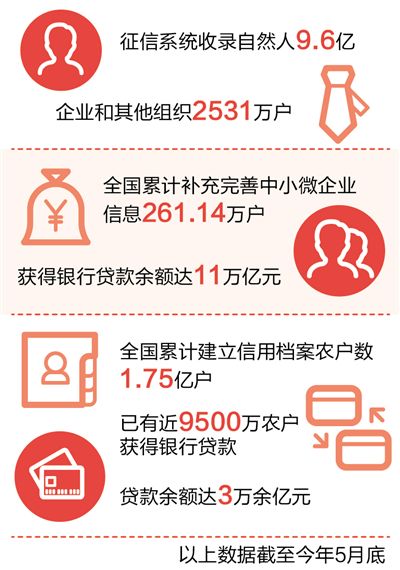 目前中國人民銀行的征信系統已建設成為國內規模最大、收集信用信息最全、覆蓋范圍和使用最廣的信用信息基礎數據庫。數據顯示,截至今年5月底,征信系統收錄自然人9.6億,企業和其他組織2531萬戶。
