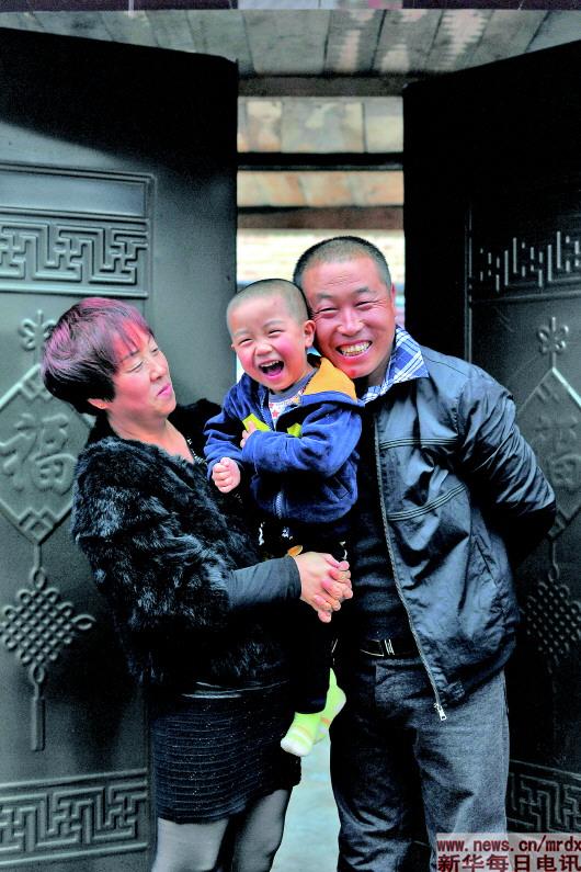 馬愛威(右)和妻子宋瑞風及兒子在家門口合影(2017年10月17日攝)。