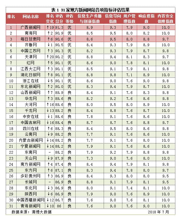 地方新聞網站媒介技術運用更趨多元化。31家地方新聞網站評估總分均值為88.9,上升0.8%,總體表現良好。信息生產傳播與創新指數與用戶管理指數環比分別上升6.3%、0.2%,其中有11家網站生態表現為優,20家表現良好。網站排名波動較大,廣西新聞網、天津網排名上升較快,得益于積極運用H5、短視頻、直播、VR、漫畫圖解等呈現新形式,弘揚主旋律,宣傳正能量。