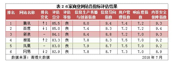 商業網站創新傳播成效凸顯,平臺內部監管自律意識亟待加強。6家商業網站7月評估等級均為良好,總評分環比上升1.9%,信息生產與創新傳播指數、用戶管理指數也分別提高1.3%、1.6%。騰訊、百度、新浪在轉載中央媒體時政新聞、社評時論方面主動積極,信息導向能力優異,總分排名分列前三。