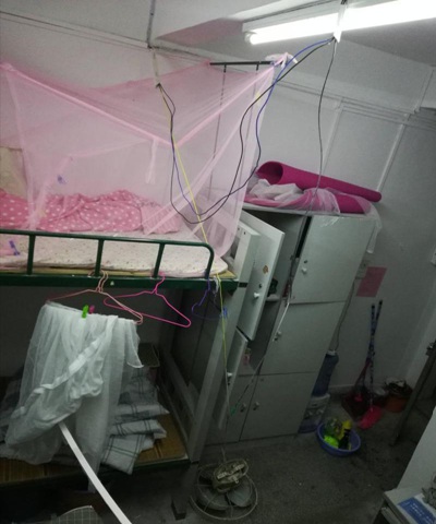 宿舍每4人一間,有獨(dú)立衛(wèi)生間,但衛(wèi)生間沒有窗戶和排氣扇,常有嚴(yán)重異味,還時常有小蟲子出沒。