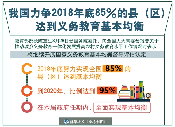 新華社北京8月28日電(記者胡浩)教育部部長陳寶生28日受國務(wù)院委托,向全國人大常委會報告關(guān)于推動城鄉(xiāng)義務(wù)教育一體化發(fā)展提高農(nóng)村義務(wù)教育水平工作情況時表示,將繼續(xù)開展國家義務(wù)教育基本均衡督導(dǎo)評估認(rèn)定,2018年底努力實現(xiàn)全國85%的縣(區(qū))達(dá)到基本均衡,到2020年,比例達(dá)到95%;在本屆政府任期內(nèi),全面實現(xiàn)基本均衡。