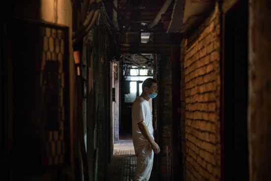 8月28日,天津市,來自山東的茂升在租住的居民樓道里乘涼。為了給妻子玉娟治療白血病,他們在與中國醫學科學院血液病醫院一墻之隔的海光新村租下一間臥室,房間悶熱潮濕,每月房費1100元,電費自理。這兩棟小樓里住著大約30戶居民,不少是跟他們一樣來津求醫的患者和家屬。視覺中國供圖