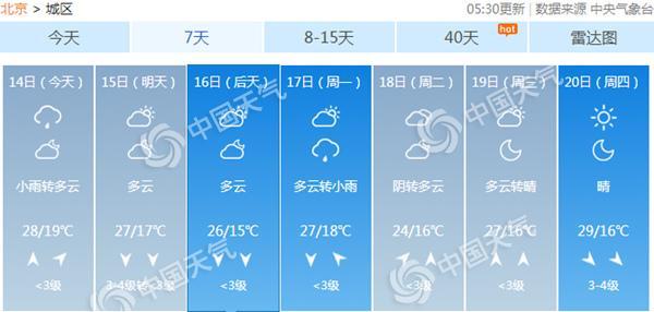 今天(14日)北京大部地區有小雨或零星小雨,早晨有輕霧或霧,公眾出行請注意交通安全。周六北風漸起,風力3-4級,晴爽的天氣將重現,周日風力減小。周末氣溫略降,最高氣溫26-27℃,早晚體感略涼,早出晚歸注意添衣。