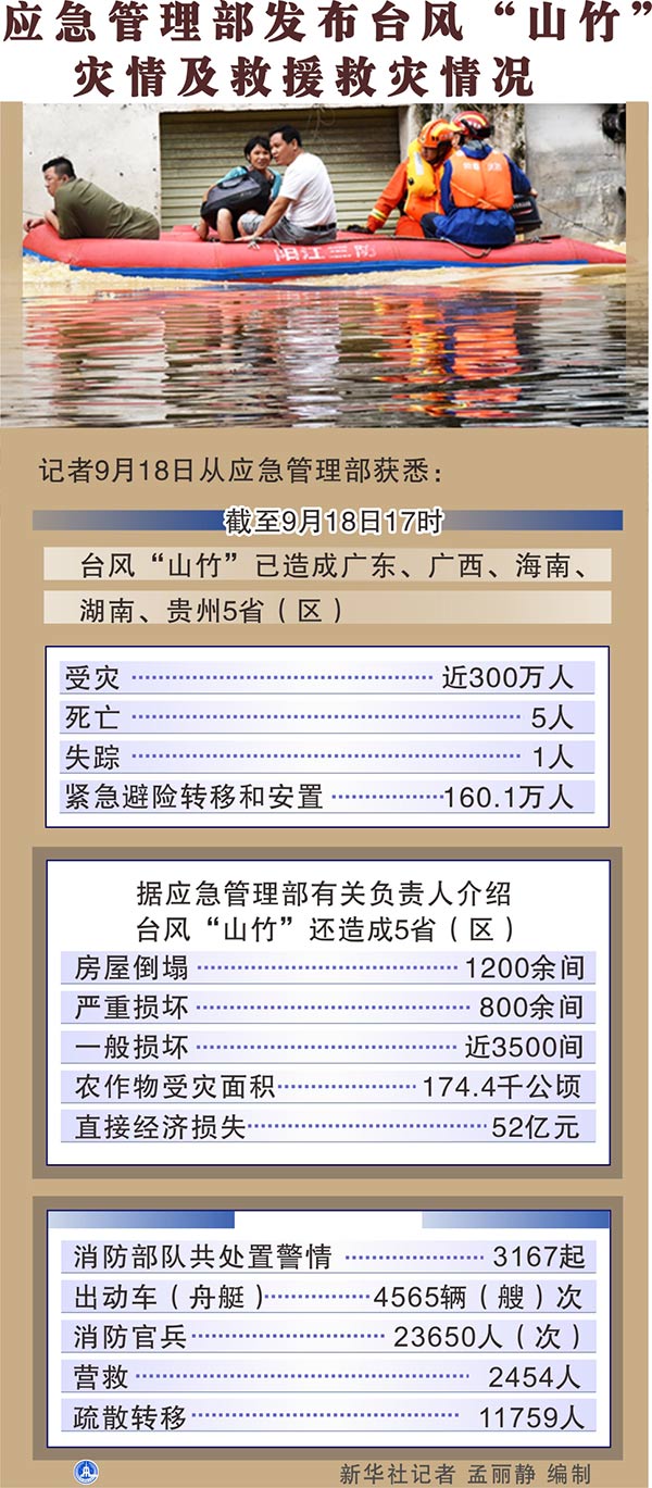 新華社北京9月18日電(記者葉昊鳴)記者18日從應(yīng)急管理部獲悉,截至18日17時(shí),臺(tái)風(fēng)“山竹”已造成廣東、廣西、海南、湖南、貴州5省(區(qū))近300萬(wàn)人受災(zāi),5人死亡,1人失蹤,160.1萬(wàn)人緊急避險(xiǎn)轉(zhuǎn)移和安置。
