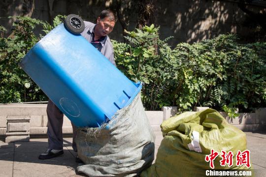 徐道海將垃圾桶筒內的垃圾裝入袋子。梅寧 攝