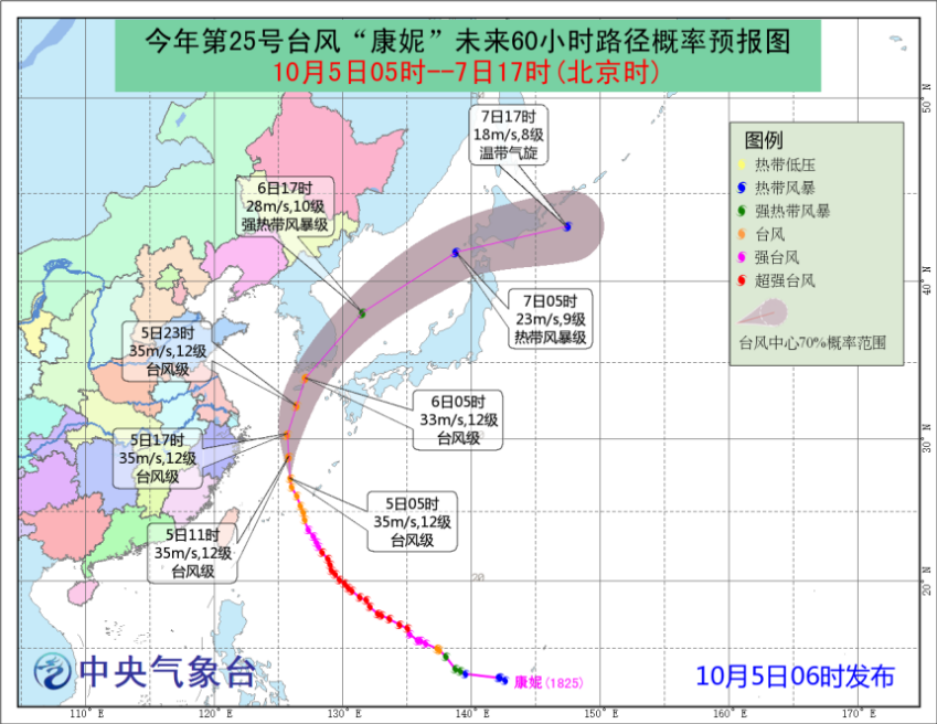 受“康妮”和冷空氣的共同影響,我國東部海域將有較大風雨,其中5日08時到6日08時,黃海南部、東海、臺灣東北洋面、浙江東部及沿海、上海沿海、江蘇沿海、杭州灣、長江口區將有7-10級大風,其中東海大部、黃海東南部的風力可達11級,“康妮”中心經過的東海東北部部分海域風力可達12級,陣風13-14級,浙江東北部、上海東部局地有中到大雨。為此,中央氣象臺10月5日06時繼續發布臺風藍色預警。