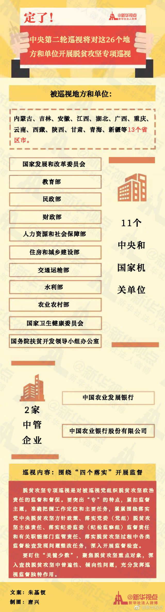 新華社北京10月9日電 經(jīng)黨中央批準,十九屆中央第二輪巡視將對內蒙古、吉林、安徽、江西、湖北、廣西、重慶、云南、西藏、陜西、甘肅、青海、新疆、國家發(fā)展和改革委員會、教育部、民政部、財政部、人力資源和社會保障部、住房和城鄉(xiāng)建設部、交通運輸部、水利部、農業(yè)農村部、國家衛(wèi)生健康委員會、國務院扶貧開發(fā)領導小組辦公室、中國農業(yè)發(fā)展銀行、中國農業(yè)銀行股份有限公司等26個地方、單位黨組織開展脫貧攻堅專項巡視。