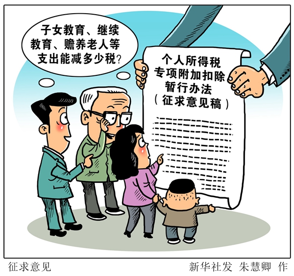 新華社北京10月20日電(記者 韓潔、劉紅霞)新一輪個(gè)人所得稅改革的一大亮點(diǎn)——專項(xiàng)附加扣除政策20日揭開(kāi)面紗。當(dāng)天起,財(cái)政部、國(guó)家稅務(wù)總局會(huì)同有關(guān)部門起草的《個(gè)人所得稅專項(xiàng)附加扣除暫行辦法(征求意見(jiàn)稿)》在兩部門官網(wǎng)開(kāi)始為期兩周的向全社會(huì)公開(kāi)征求意見(jiàn)。