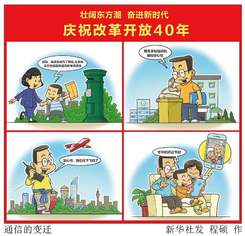 通信:以前,我們靠寫信,讓爸媽在外地也能知道我們的考試成績;后來,我們用座機,告訴爸媽“我在學校挺好的”;再后來,我們無論出行到哪里,都可以隨時拿出手機跟家人說聲“放心吧”;如今,我們更加可以方便地打開手機視頻,問候爺爺奶奶“過節好”。↓↓