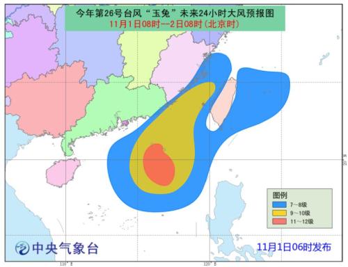 受“玉兔”和冷空氣共同影響,11月 1日08時到11月2日08時,廣東東部、福建中南部沿海、臺灣東部和南部等地將有大雨,局地有暴雨或大暴雨(50~110毫米)。東海南部偏南海域、臺灣以東洋面、巴士海峽、南海中東部偏北海域和南海西北部偏東海域及臺灣沿海將有7~8級大風,陣風9~10級;臺灣海峽、福建沿海、廣東東部沿海、南海東北部大部海域風力達9~10級,陣風11~12級;“玉兔”中心經過的南海東北部的部分海域或地區的風力可達11~12級,陣風13~14級(見圖2)。