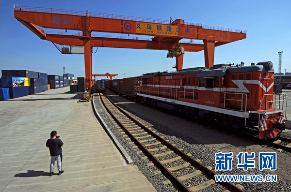 在義烏鐵路西站,一列駛往西班牙馬德里的中歐班列(義烏)緩緩發車(10月27日攝)。新華社記者 譚進 攝