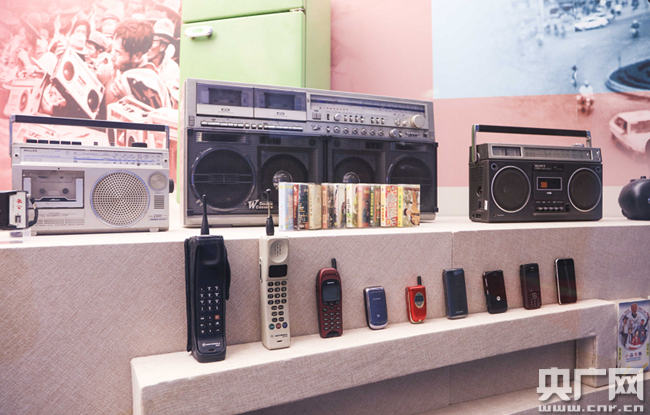 圖為館內展示的收音機、磁帶及手機。(央廣網記者 荊宇琦 攝)