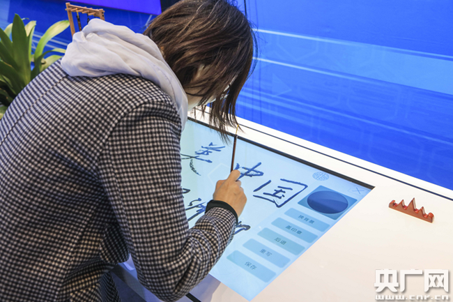 參觀者可以在電子屏幕上寫下“毛筆字”。(央廣網記者 荊宇琦 攝)