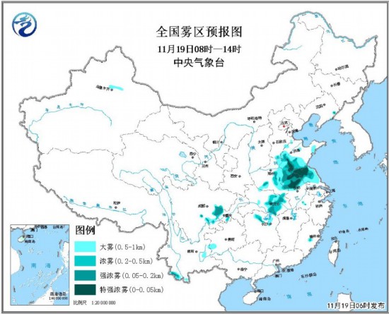 預計,11月19日早晨至上午,山東西部、河南中東部、安徽中北部、江蘇中北部、湖北中東部、四川盆地中部等地有大霧,其中山東西南部、安徽北部、江蘇北部等地的部分地區有能見度不足50米的特強濃霧。