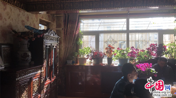尕瑪文索的新家在統建區的一棟居民樓內,房間里擺滿了藏族特色的家具和裝飾品,各種花朵盆栽占據了整個陽臺?!靶路孔拥亩旌拖奶煲粯优?,花可以繼續長,什么植物都可以養。”“暖和”成了尕瑪文索對新房子最大的印象。