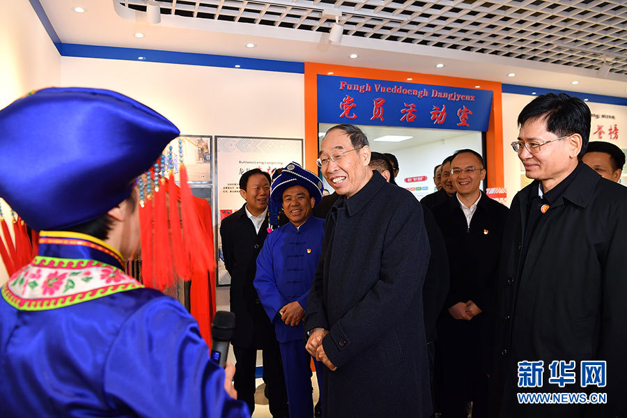 在港北區(qū)港城街道龍井村,尤權(quán)考察了村委辦公樓、便民服務(wù)大廳、壯族文化展館,聽取民族團(tuán)結(jié)進(jìn)步創(chuàng)建等情況介紹,與少數(shù)民族群眾親切交談,祝愿他們?nèi)兆右惶毂纫惶旌茫钤絹碓叫腋!?/p>