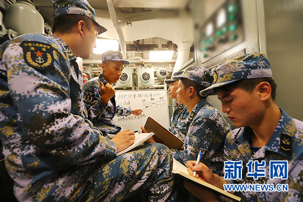 肖海生(左二)利用訓練間隙為戰友講解AIP系統常見故障及處置方法(2017年6月2日攝)。 新華社發(韓林 攝)