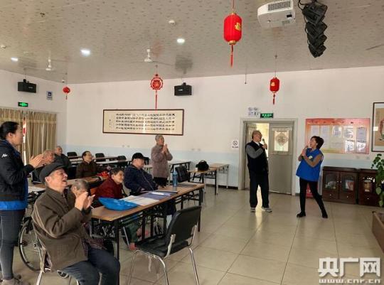 每周四上午,護(hù)理院都會(huì)組織老人進(jìn)行歌詠比賽,圖為于安安與護(hù)理院的老人一同唱歌(央廣記者 孫冰潔 攝)