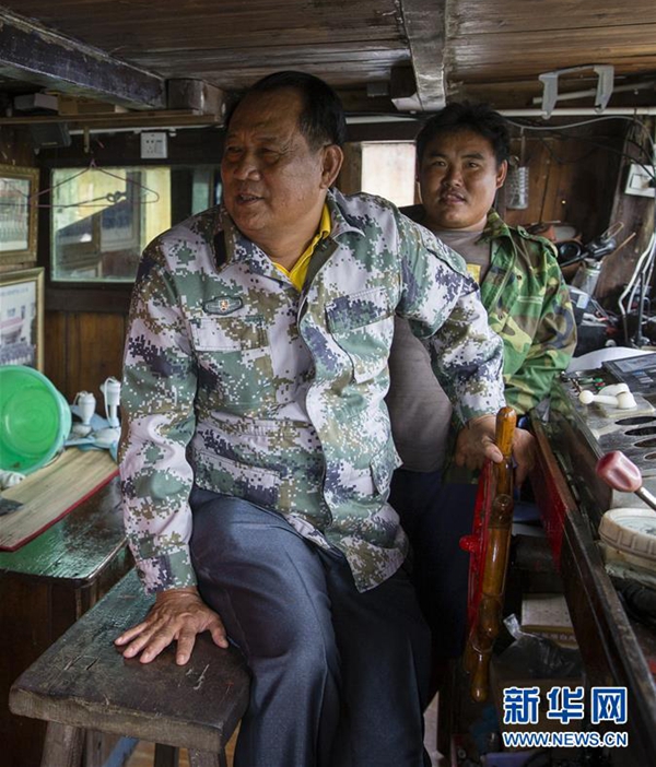 11月14日,在海南省瓊海市潭門鎮,王書茂(左)在漁船上。 新華社發(宋國強 攝)