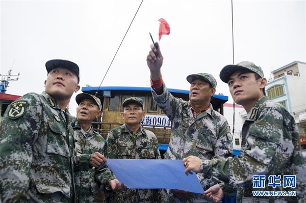 12月10日,在海南省瓊海市潭門鎮,王書茂(右二)組織民兵開展訓練。 新華社發(宋國強 攝)