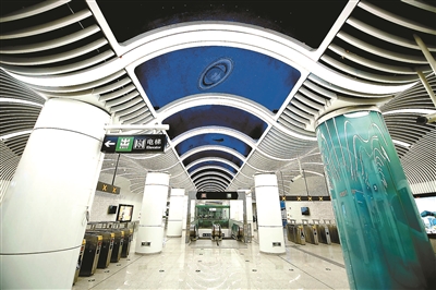 “整條線主要體現了‘門中觀軸’的概念,永定門外、大紅門站廳里都有城門設計。中心城區里的三站,我們采用古曲紅和灰色的概念來設計;再往南走的站,逐漸會變化為黃色、藍色、綠色;木樨園過去有過麋鹿,所以我們設計了花草;海戶屯過去是獵場,我們設計了八匹駿馬……”2018年歲末,貫穿南中軸的地鐵8號線三期南段和四期共將開通13站。昨天,北京青年報記者提前感受了這條特別的地鐵線路。一站一個景觀,從古代城門穿越到天空之門,從天橋壁畫再到宇航視野,坐上地鐵就好似從老北京向新北京“穿越”。