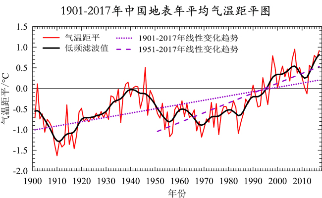 1901-2017年中國地表年平均氣溫距平圖 圖片數據來源:國家氣候中心