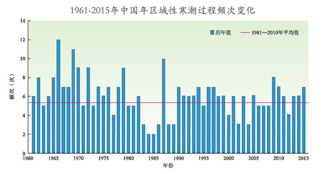 1961-2015年中國年區域性寒潮過程頻次變化 圖片數據來源:國家氣候中心