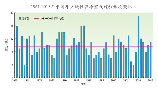 1961-2015年中國年區域性強冷空氣過程頻次變化 圖片數據來源:國家氣候中心