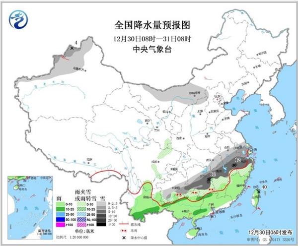 中央氣象臺預計,今天內蒙古西部、新疆北部、江淮中南部、江漢東部、江南中北部、西南地區東南部等地部分地區有小到中雪或雨夾雪,其中,貴州東南部、湖南中部、江西北部、安徽南部、浙江中北部等地有大雪,湖南東部、江西西部和東北部、安徽南部、浙江西部等地局地有暴雪(10~12毫米)。江南南部、西南地區南部、華南大部和臺灣島大部等地部分地區有小到中雨,其中,臺灣島東北部局地有大雨(25~40毫米)。