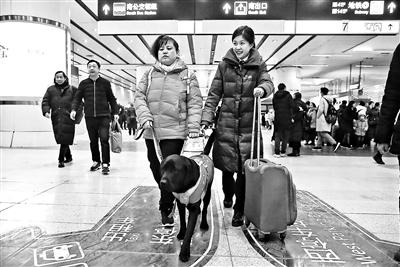 從北京南站站臺到地下停車場的路上,黑萌萌要經過電梯,繞過障礙物。第一次看到火車站川流不息的人群,黑萌萌剛開始有些無所適從,在南站潤秋服務組張潤秋的幫助和陳燕不斷發出的“good good”的鼓勵下,它很快適應了新環境。張潤秋說,以前珍妮和陳燕來北京南站乘坐高鐵,服務組的工作人員都會接送,和她們成了好朋友,現在黑萌萌接班,相信它也一定能當好陳燕的眼睛。(記者 王薇)