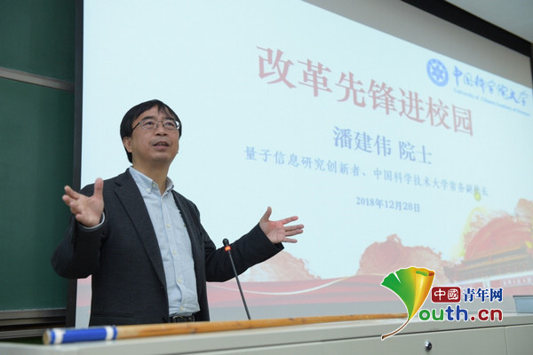 12月28日,潘建偉院士在成立于1978年、與改革開放同頻共振的中國(guó)科學(xué)院大學(xué)做了一場(chǎng)精彩的報(bào)告,第一教學(xué)樓101報(bào)告廳人山人海,過道和門口都擠滿了學(xué)生,另外開辟的直播教室也座無虛席。